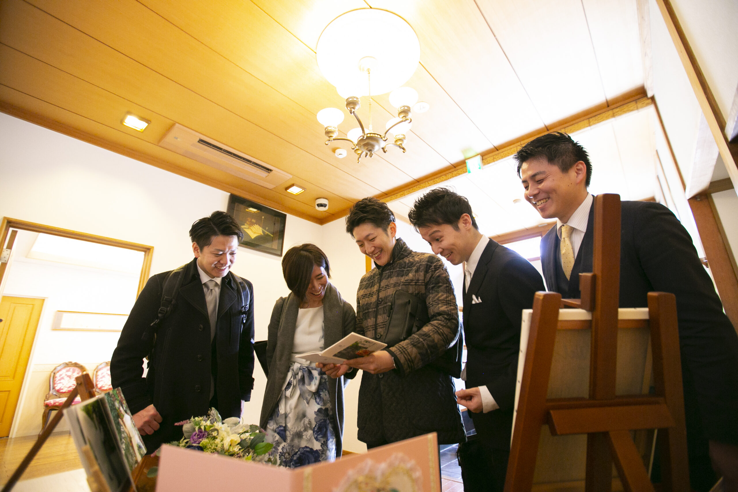 手作りのウェルカムアイテムと前撮りのお写真を飾ったウェルカムスペースには、皆様が集まっておりました。