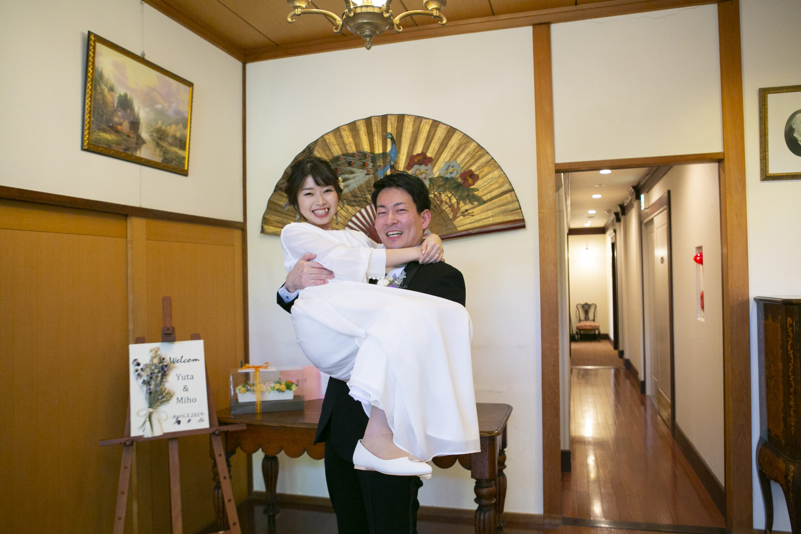 手を伸ばし、新郎様のネクタイを結ぶ新婦様。笑顔で答えながら、フワッとお姫様抱っこまで。沢山の仲睦まじいお姿を見せて下さいました♪