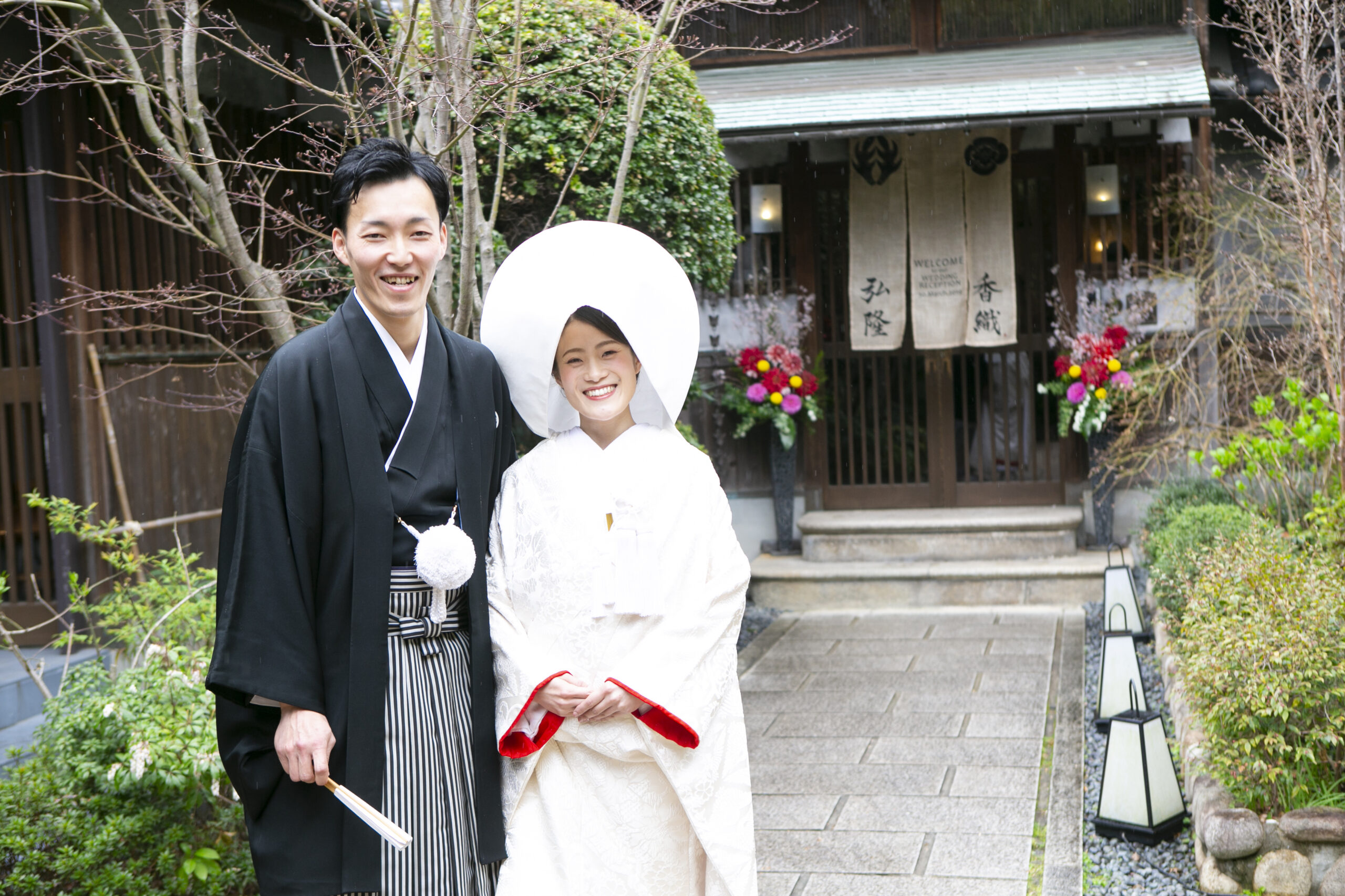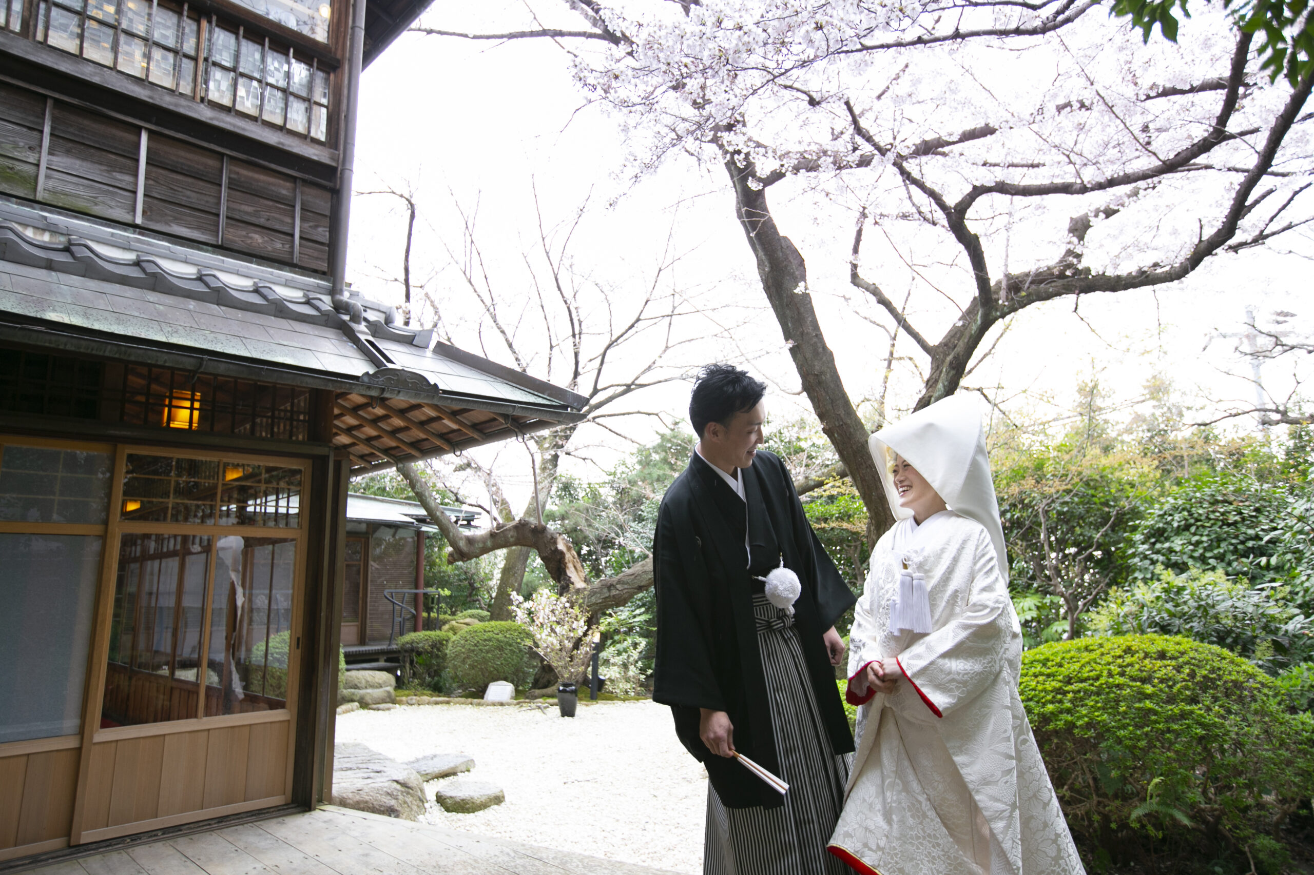 “1塁”和庭園では、満開の桜の下顔を見合わせ微笑むお2人。