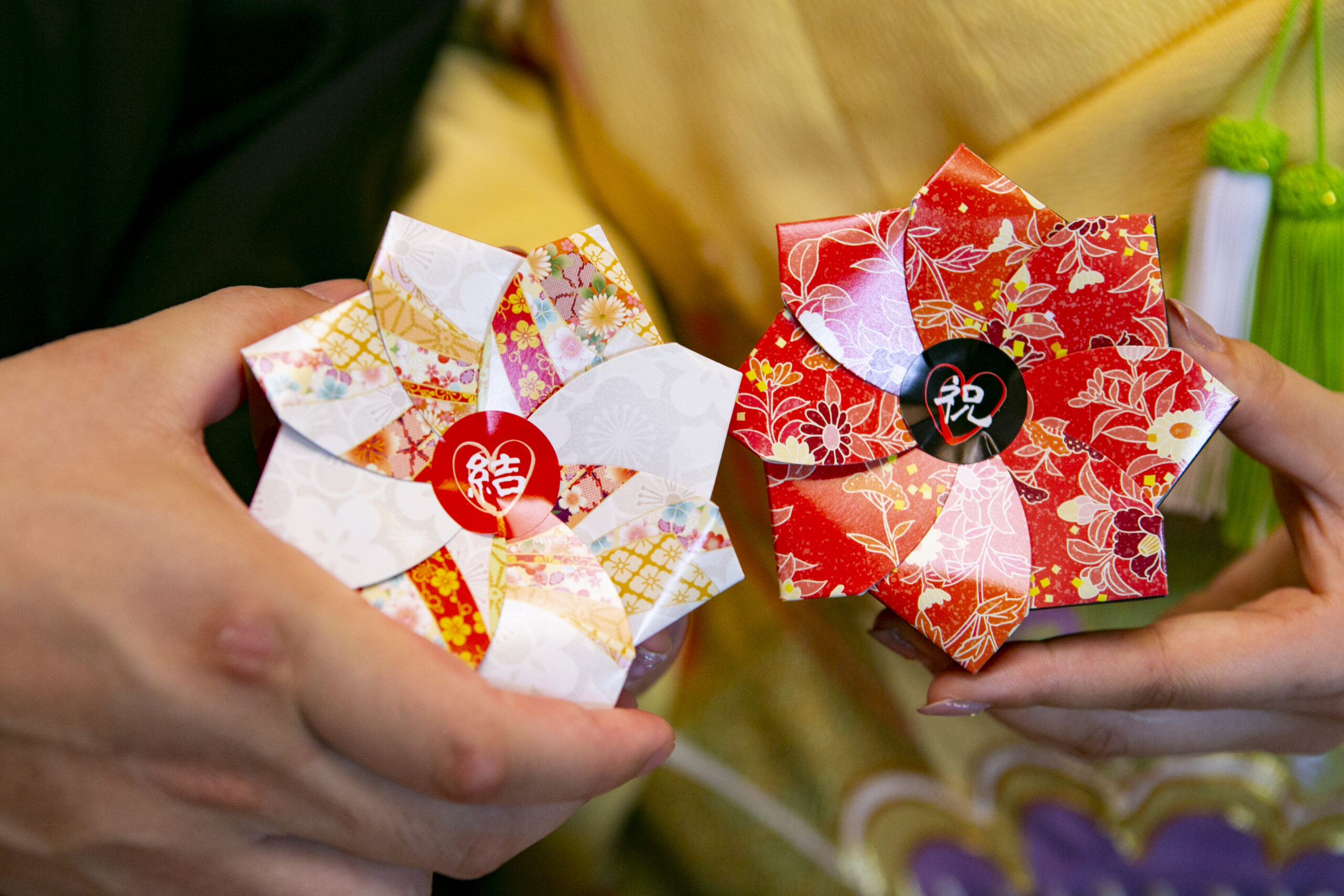 挙式の結びにはお2人が手作りされた折り鶴シャワーでお祝いを。